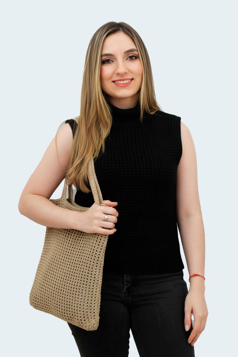 Bolso tejido huecos con cargadera. Tejido Ecológico 30% pet reciclado, 70% algodón reciclado. Hecho por manos colombianas. Ancho 38cm x Largo 37cm.