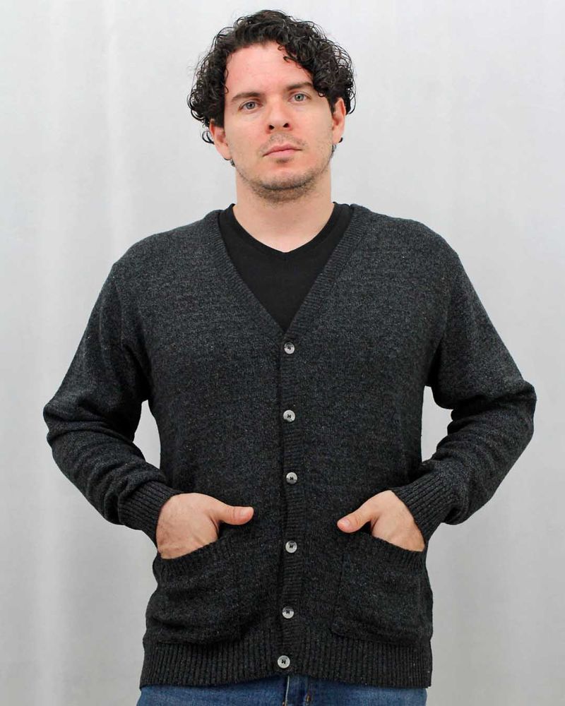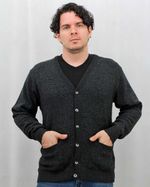 Cárdigan hecho con materiales ecológicos, cuello V, manga larga con bolsillos y botones para hombre.Tejido Ecológico grueso 50% Pet Reciclado 50% algodón Reciclado.Hecho por manos colombianas